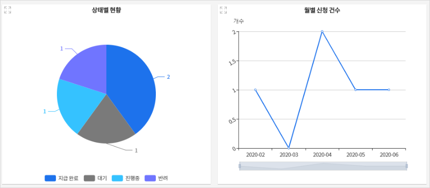 - 상태별, 월별 신청건수 현황을 그래프로 확인할 수 있고, 프로세스를 통해 실시간으로 상태 변화를 확인할 수 있습니다.