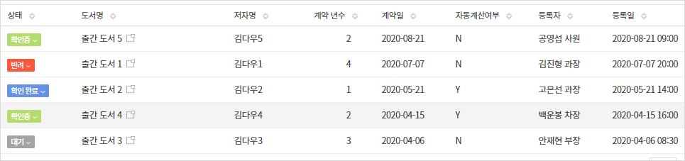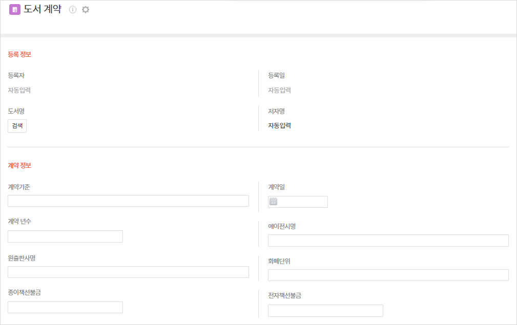 도서 계약 건을 등록할 수 있습니다. "출간 도서 리스트" 앱과 연동처리되어 사용할 수 있습니다.