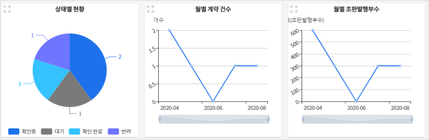- 상태별, 월별 계약 건수, 월별 초판발행부수에 대한 현황을 그래프로 확인할 수 있고, 프로세스를 통해 실시간으로 상태 변화를 확인할 수 있습니다.