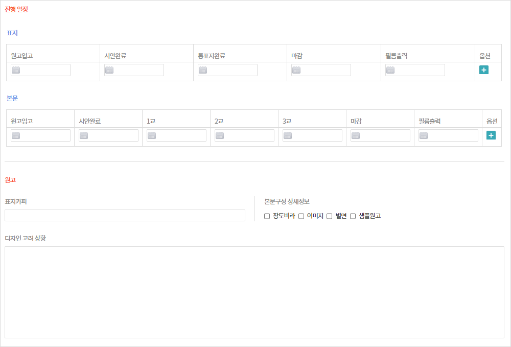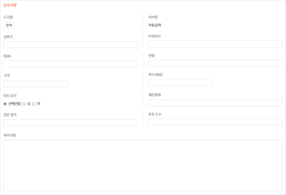 - 옵션버튼을 이용하여 표지와 본문에 대한 정보를 추가로 입력할 수 있고, 원고와 컨셉에 대한 정보를 자세하게 입력할 수 있습니다.