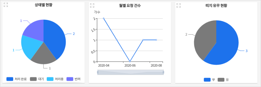 - 상태별, 월별 요청 건수, 띠지 유무 현황에 대해 그래프로 확인할 수 있고, 프로세스를 통해 실시간으로 상태 변화를 확인할 수 있습니다.