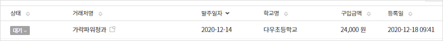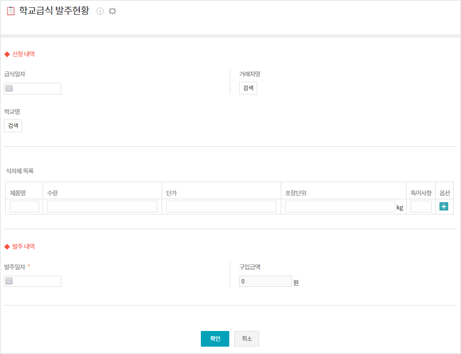 학교 담당자들이 필요한 급식 재료를 주문/신청하고 내역을 집계하여 납품할 수 있습니다.