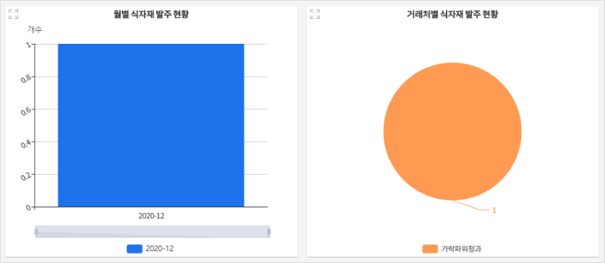 - 월별 식자재 발주, 거래처별 식자재 발주 현황에 대해 그래프로 확인할 수 있고, 프로세스를 통해 실시간으로 상태 변화를 확인할 수 있습니다.
