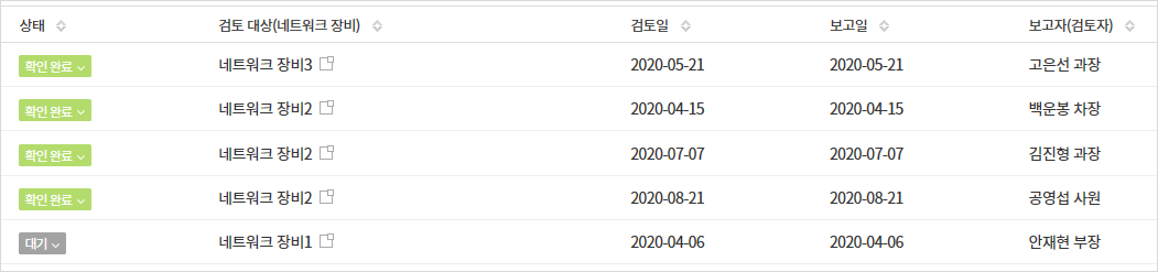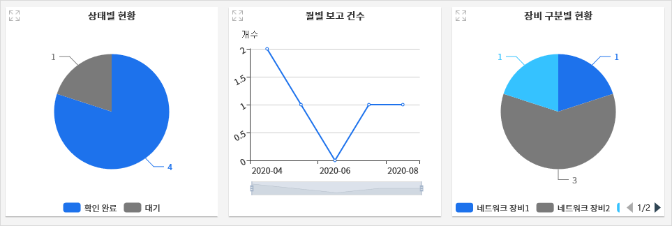 - 상태별, 월별 보고 건수, 장비 구분별 현황에 대해 그래프로 확인할 수 있고, 상태를 통해 업무 현황에 대해 한눈에 볼 수 있습니다.