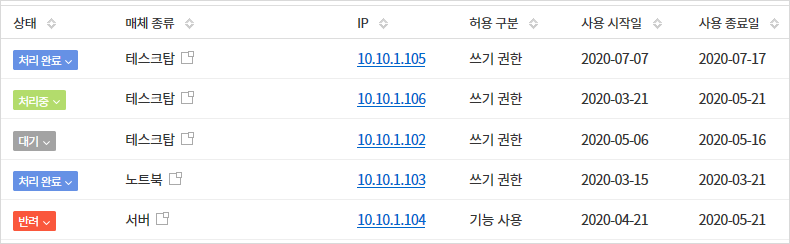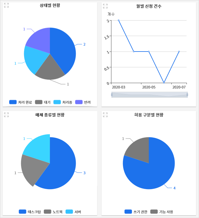 - 상태, 월, 매체 종류, 허용 구분별로 그래프를 통해 확인할 수 있고, 다양한 상태처리를 통해 작업상태를 한눈에 확인할 수 있습니다.