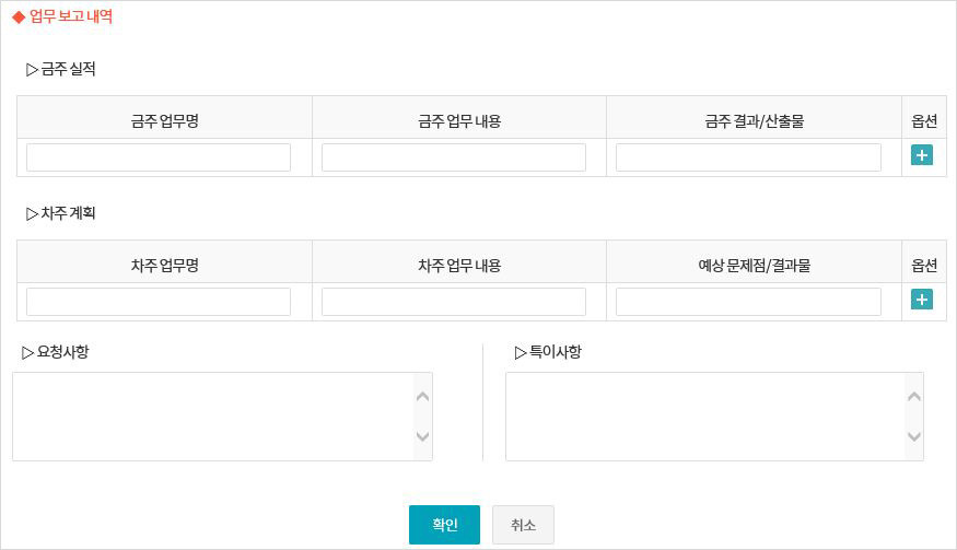 - 금주 실적, 차주 계획, 요청사항, 특이사항 등의 정보를 등록하여 주간 업무보고 내역을 관리할 수 있습니다.