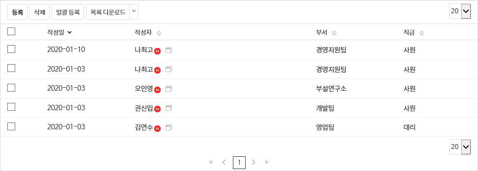- 작성일에 따른 작성자, 부서, 직급 정보를 목록에서 확인할 수 있습니다.
