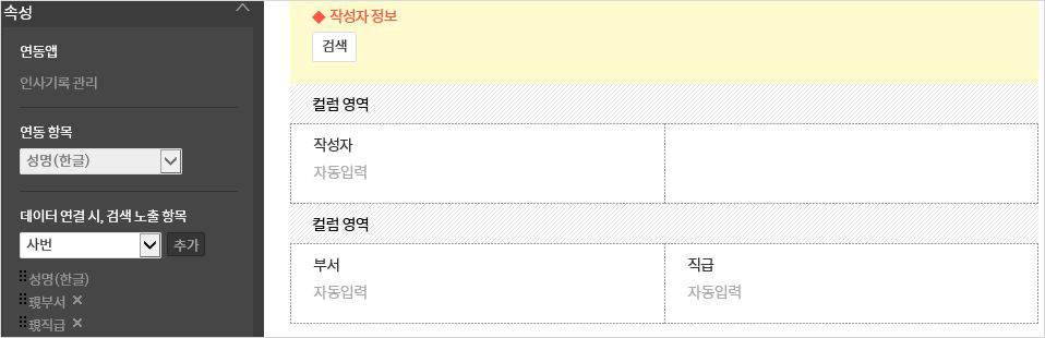 - 작성자 정보는 “인사기록 관리” 앱과 연동되어 자동입력 됩니다.