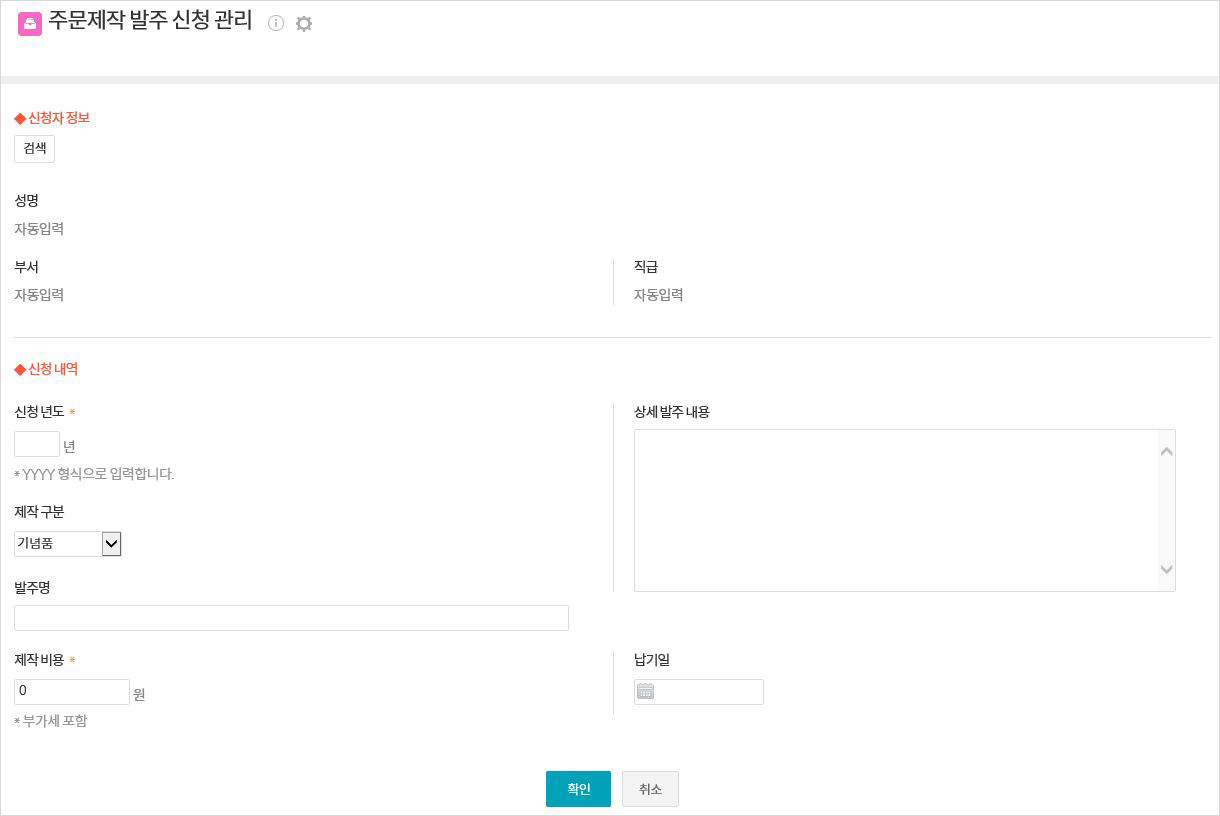 - 신청자 정보를 선택하고 주문 제작 구분, 발주명, 발주 내용, 비용 등의 신청 내역을 입력한 후 확인을 클릭하여 주문제작 발주를 신청할 수 있습니다.