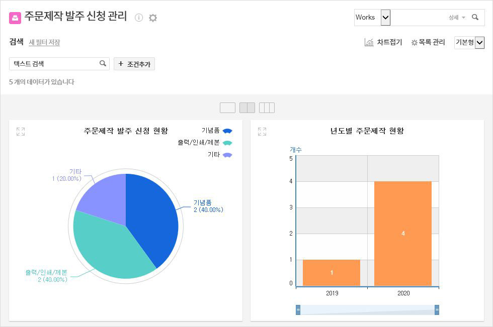- 구분별 발주 신청건수, 년도별 주문제작 건수 등의 현황 정보를 그래프로 확인할 수 있습니다.