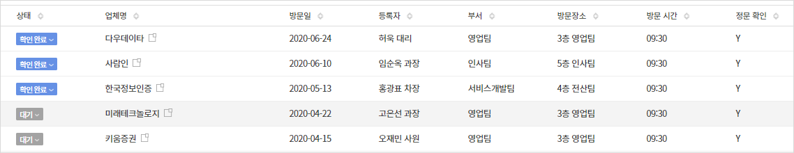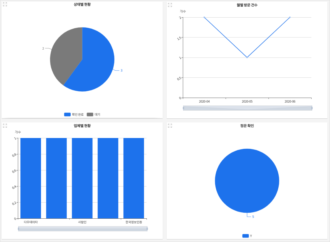 - 상태별, 월별, 업체별, 정문 확인의 현황에 대한 그래프를 확인할 수 있고, 프로세스를 통해 실시간으로 상태 변화를 확인할 수 있습니다.