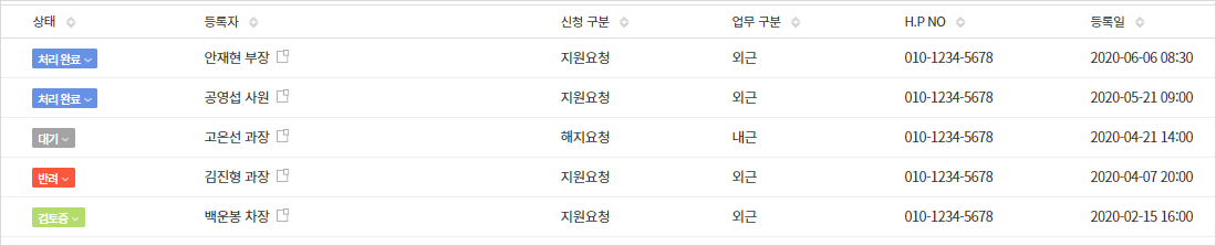 - 상태별, 월별, 신청 구분별, 업무 구분별 현황에 대한 그래프를 확인할 수 있고, 프로세스를 통해 실시간으로 상태 변화를 확인할 수 있습니다.
