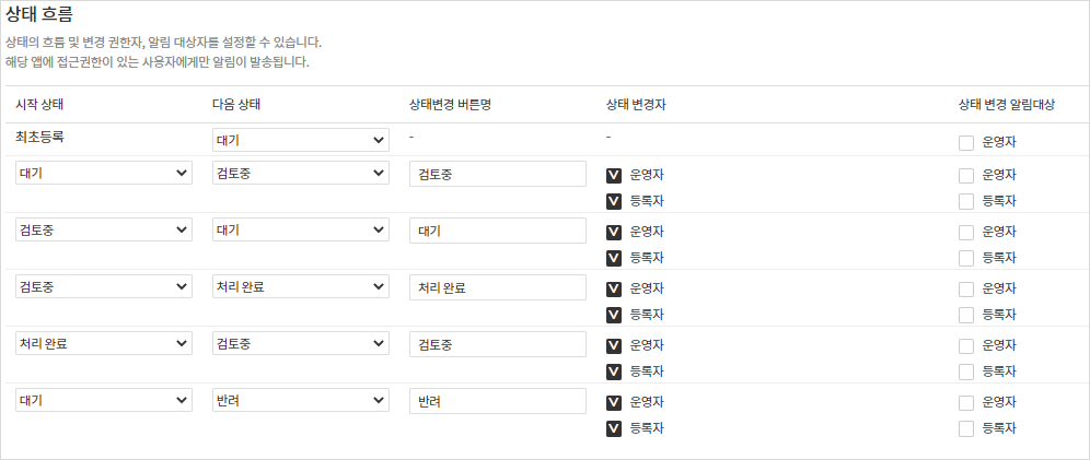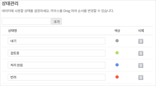 - 다양한 상태명 정의로 프로세스에 반영할 수 있고, 상태 흐름 및 변경 권한자를 설정할 수 있습니다.