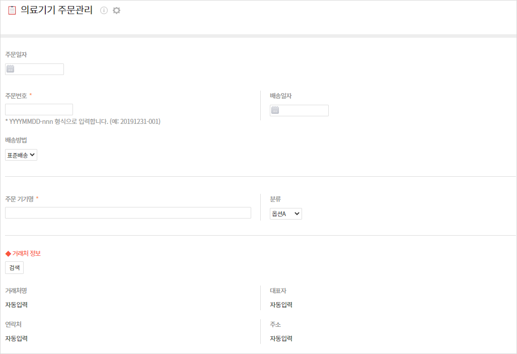 - 거래처 정보는 "거래처 관리" 앱과 연동처리되어 검색되어 정보가 입력되고, 주문 내역에 대해 세부 내용을 적을 수 있습니다.