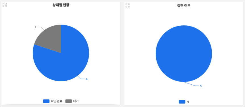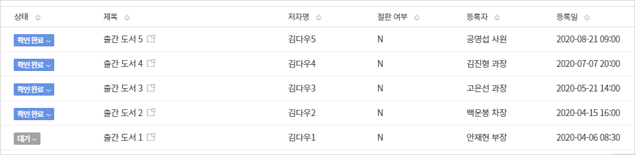 - 상태별, 절판 여부의 현황을 그래프로 확인할 수 있고, 도서 리스트를 상태처리와 함께 목록으로 한눈에 볼 수 있습니다.