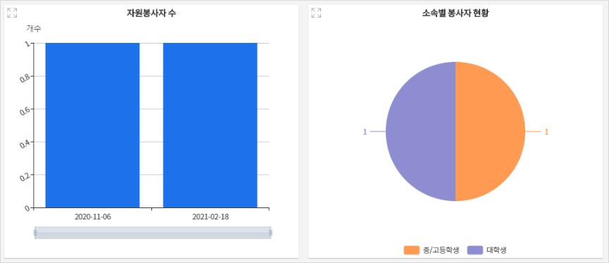 - 자원봉사자 수, 소속별 봉사자 현황에 대해 그래프로 확인할 수 있고, 목록을 통해 봉사자 정보를 한눈에 확인할 수 있습니다.