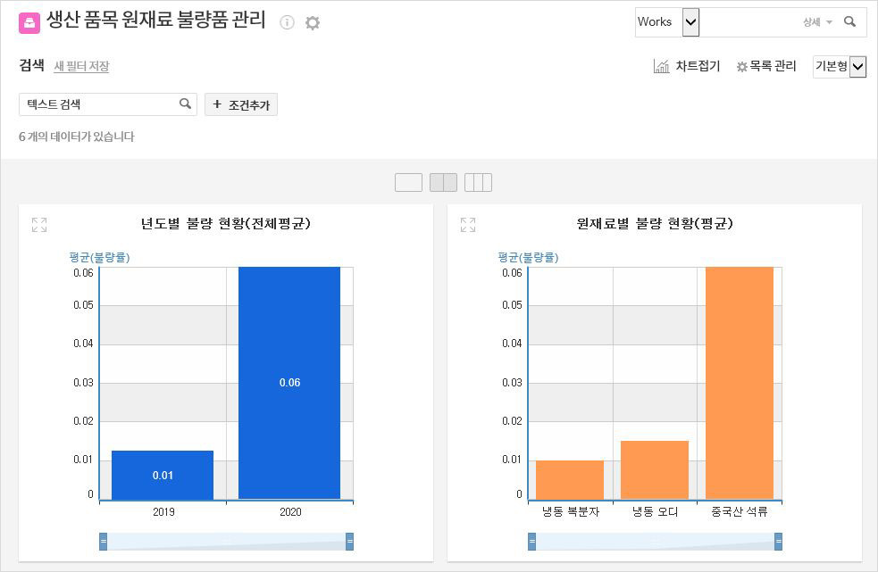 - 연도별 불량 현황 및 원재료별 불량 현황을 그래프로 확인하실 수 있습니다.